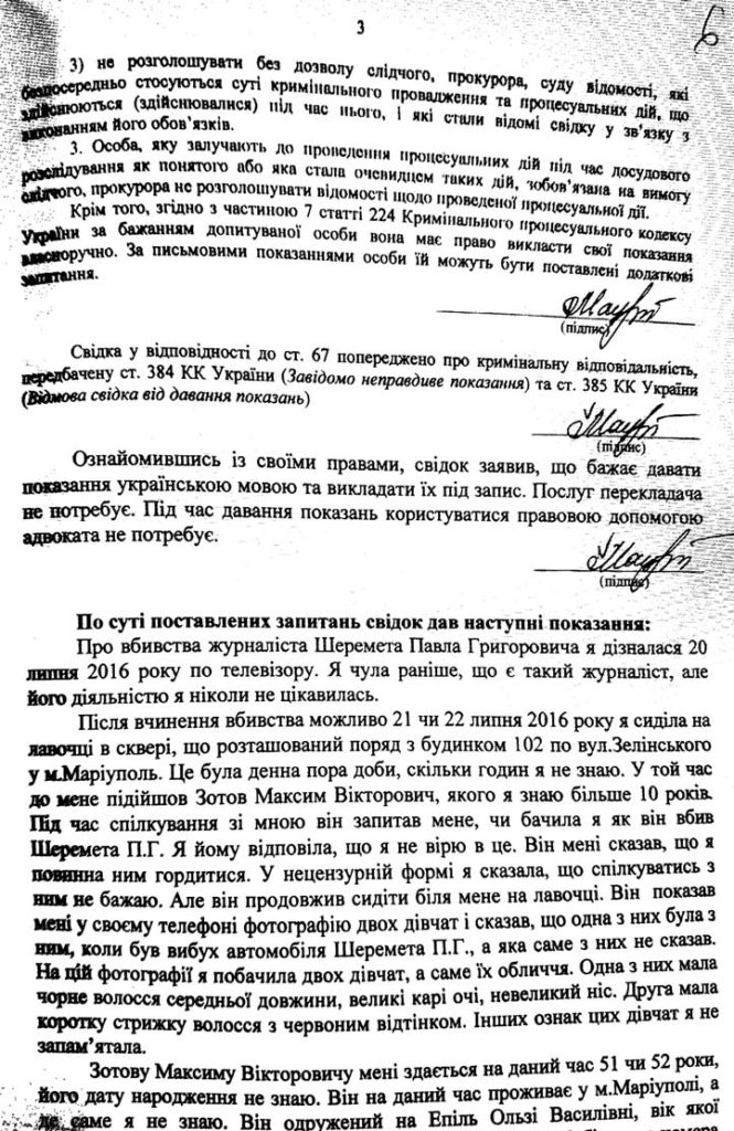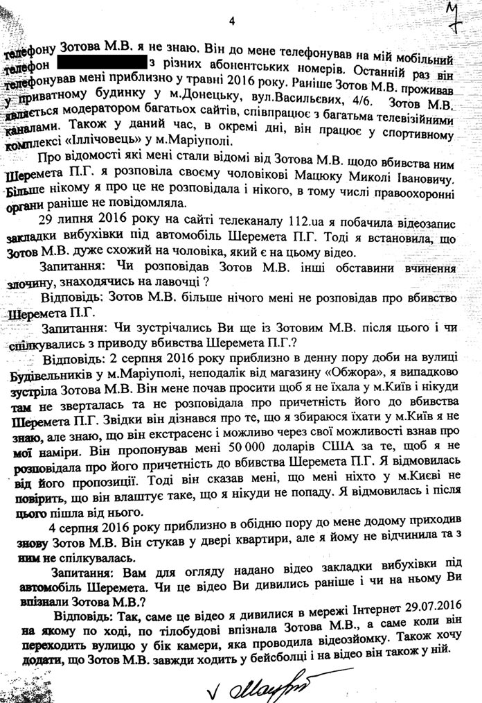 За словами Мацюк, 21 або 22 липня, коли вона сиділа на лавочці неподалік свого будинку в Маріуполі, до неї підійшов Максим Зотов і запитав, чи бачила вона, як він «убив Шеремета». Мацюк відповіла, що не вірить йому. Зото, відповів, що та «має пишатися ним» і показав фотографію в телефоні, на якій були зображені дві дівчини.