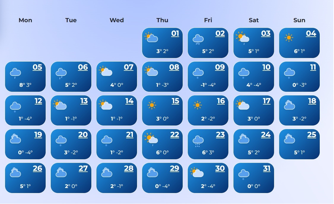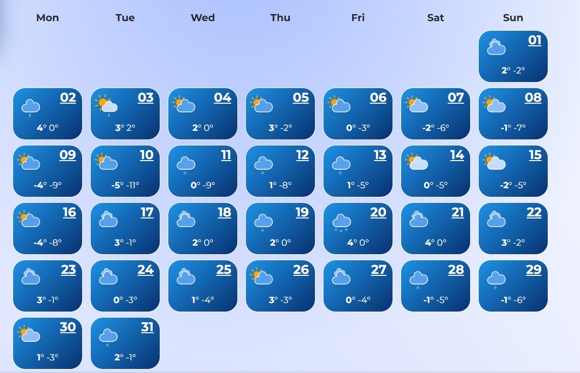 Мінімальна температура вдень становитиме -5, а максимальна +4. Максимальна температура вночі становитиме +2, а найхолоднішої вночі буде 10 січня. Тоді чекають на -11. 20 січня прогнозують сильний снігопад.