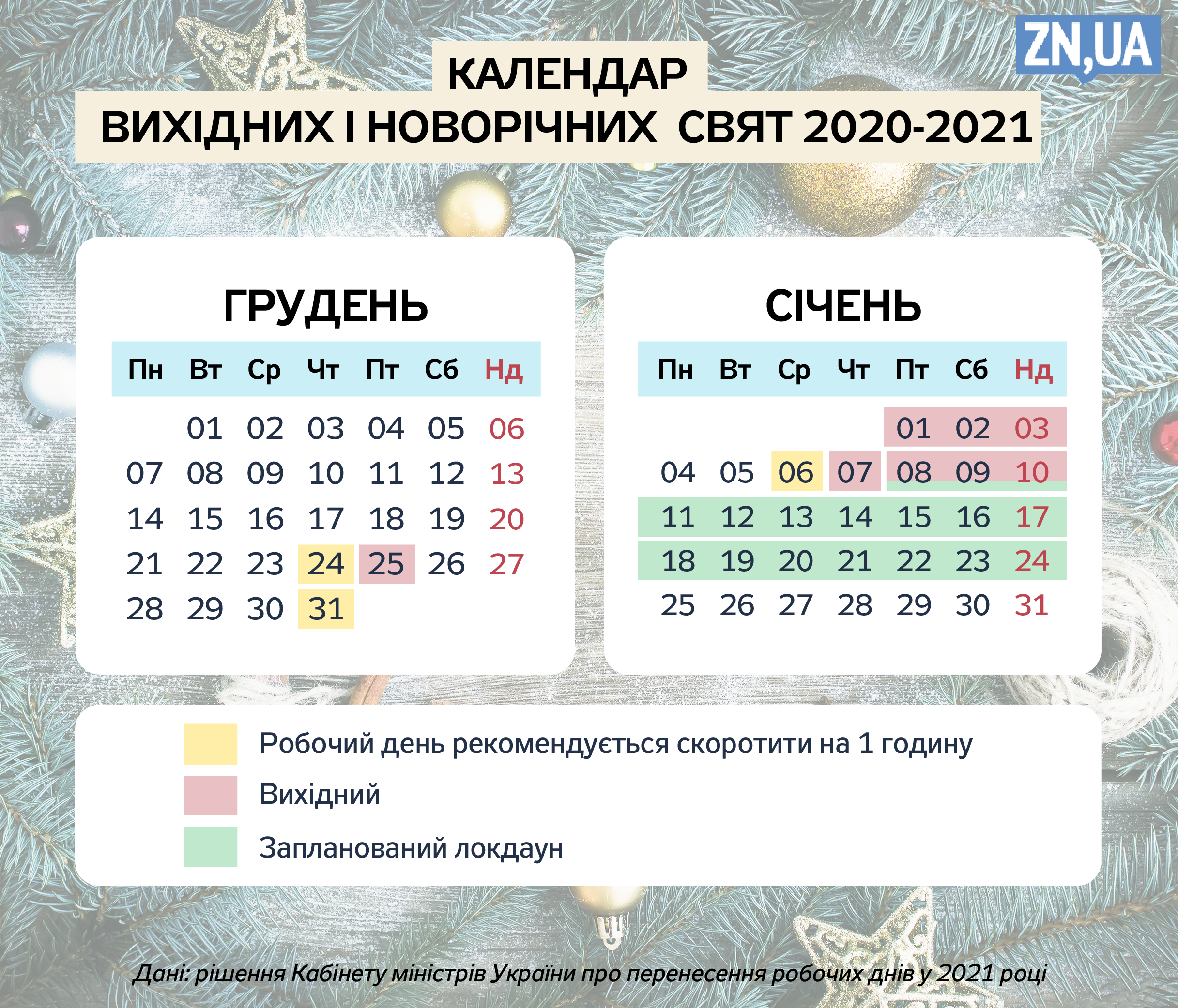 У період новорічних і різдвяних свят на українців упродовж січня чекає 12 вихідних. Про це йдеться в рішенні Кабінету Міністрів про перенесення робочих днів у 2021 році.