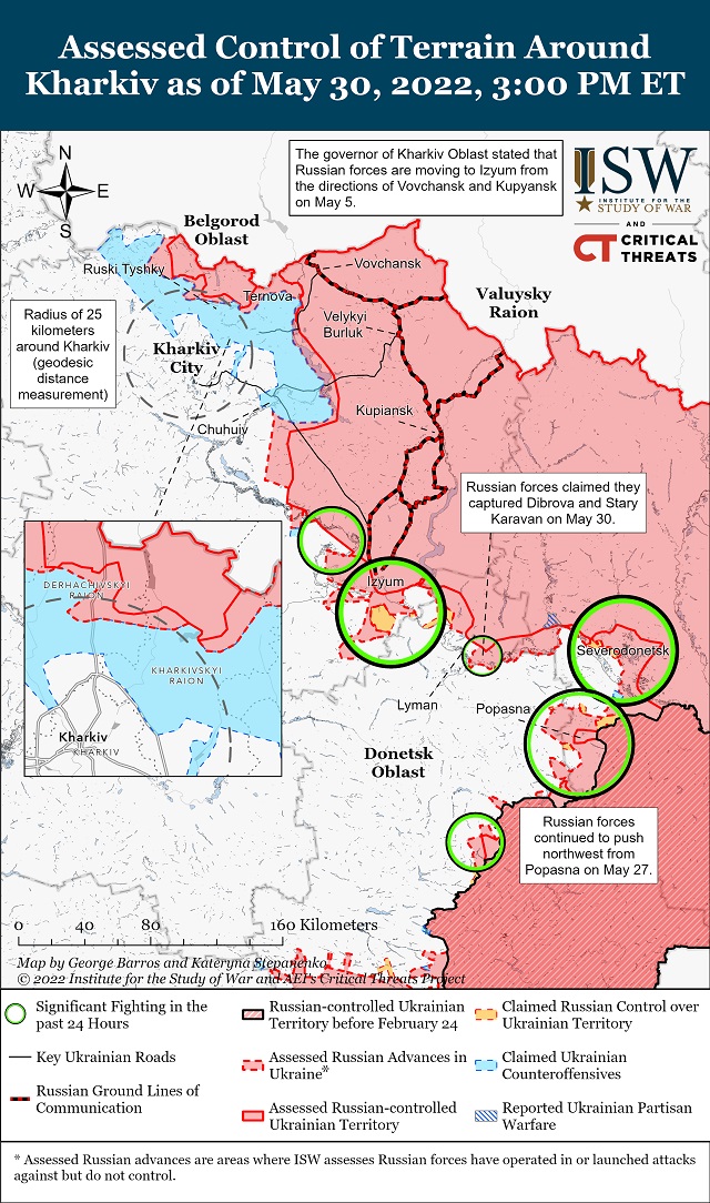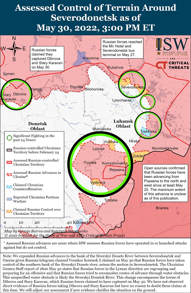 Також у звіті сказано, що російські війська продовжували поступово захоплювати мікрорайони Сєверодонецька, але ще повністю не оточили місто.