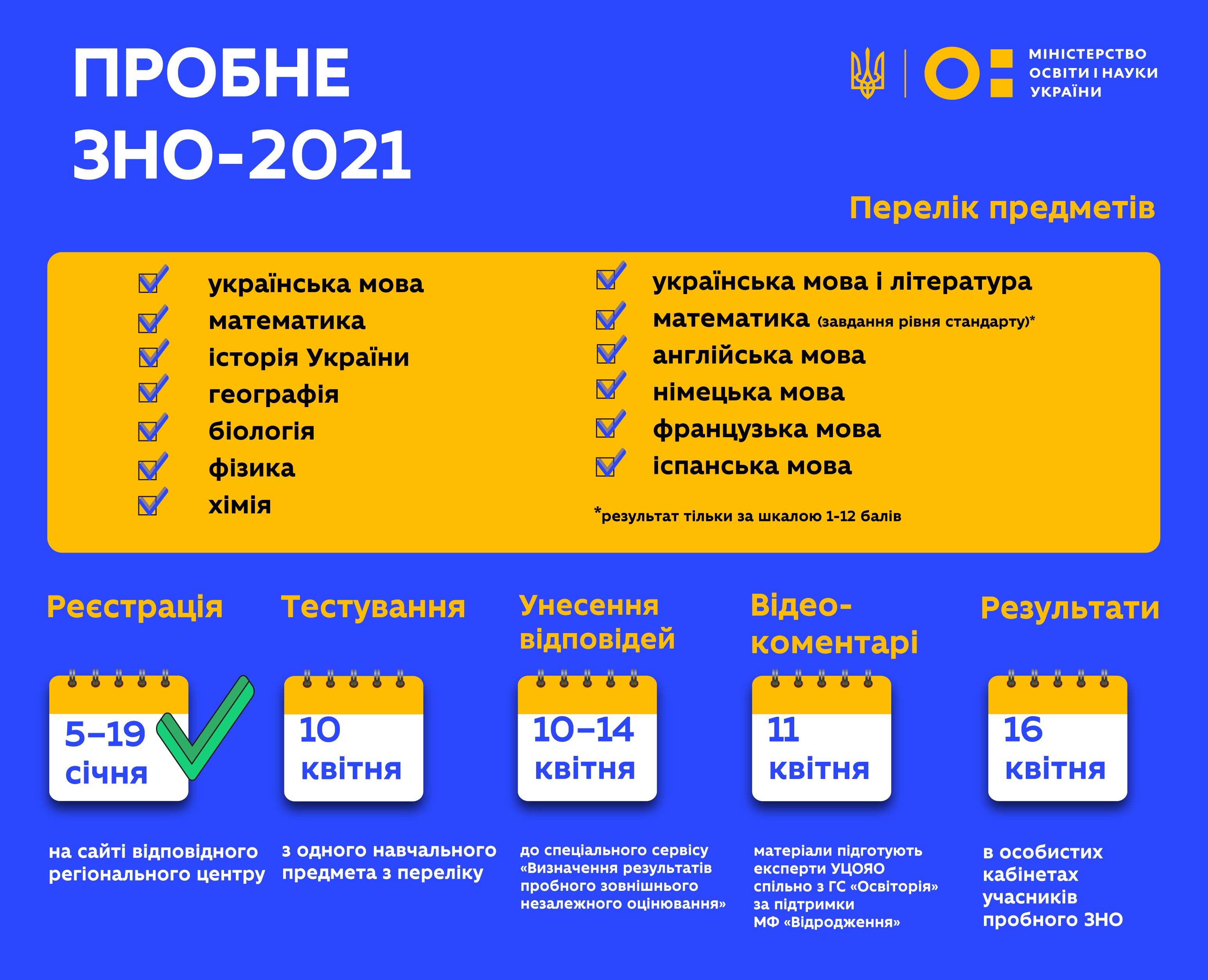 Так, пробне ЗНО відбудеться 10 квітня. Через епідситуацію учасники тестування зможуть обрати лише один предмет. При цьому тестові зошити можна буде завантажити зі всіх навчальних предметів, та вирішити завдання вдома. Після цього відповіді на тести можна внести у форми на спеціальному сервісі для визначення результатів. Результати пробного ЗНО оприлюднять 16 квітня.