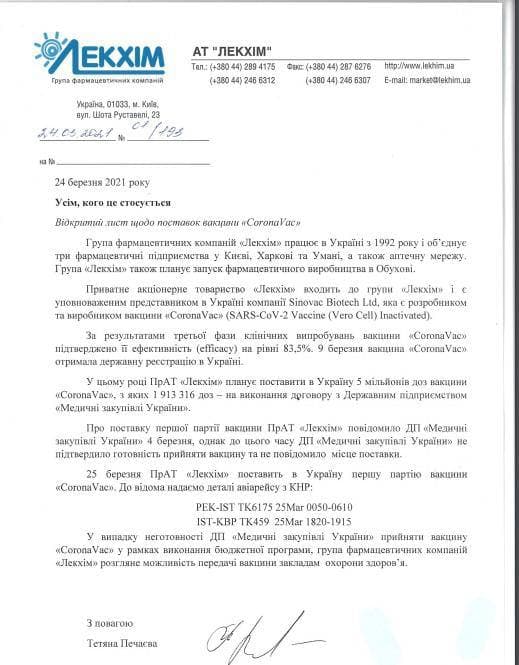24 березня АТ “Лекхім” розіслала в ЗМІ листа, в якому повідомляє, що 25 березня поставить в Україну першу партію китайської вакцини CoronaVaс. У листі йдеться про те, що “Лекхім” 4 березня повідомив про свій намір поставити вакцину ДП “Медзакупівлі”. Однак, хоча відповіді про готовність її прийняти не отримав, все одне везе вакцину в Україну.