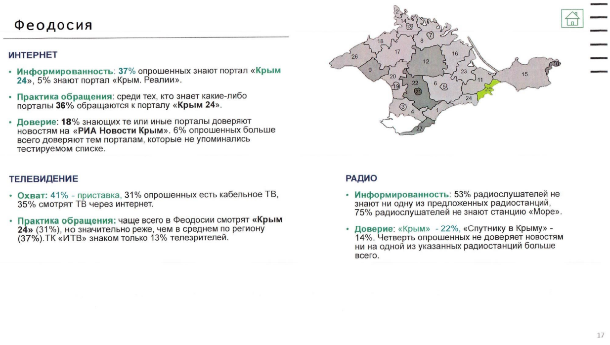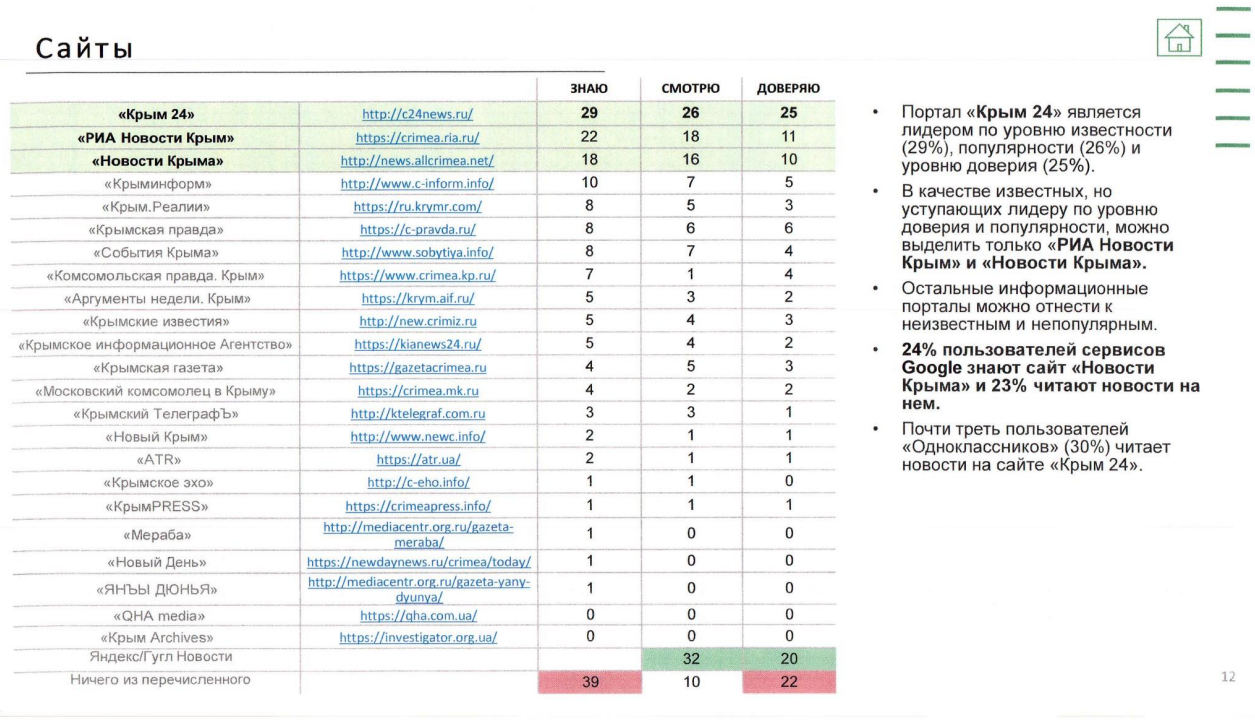Безумовним лідером переваги серед жителів окупованого півострова є російські онлайн-ресурси та телеканали: "Крим 24", "РИА Новости Крим", "Новини Криму". Але звертає на себе увагу те, що п'яте місце займає проєкт української служби "Радіо свобода" "Крим. Реалії".