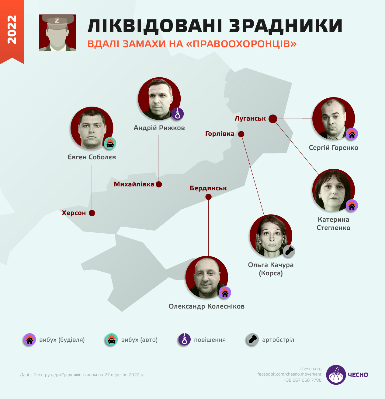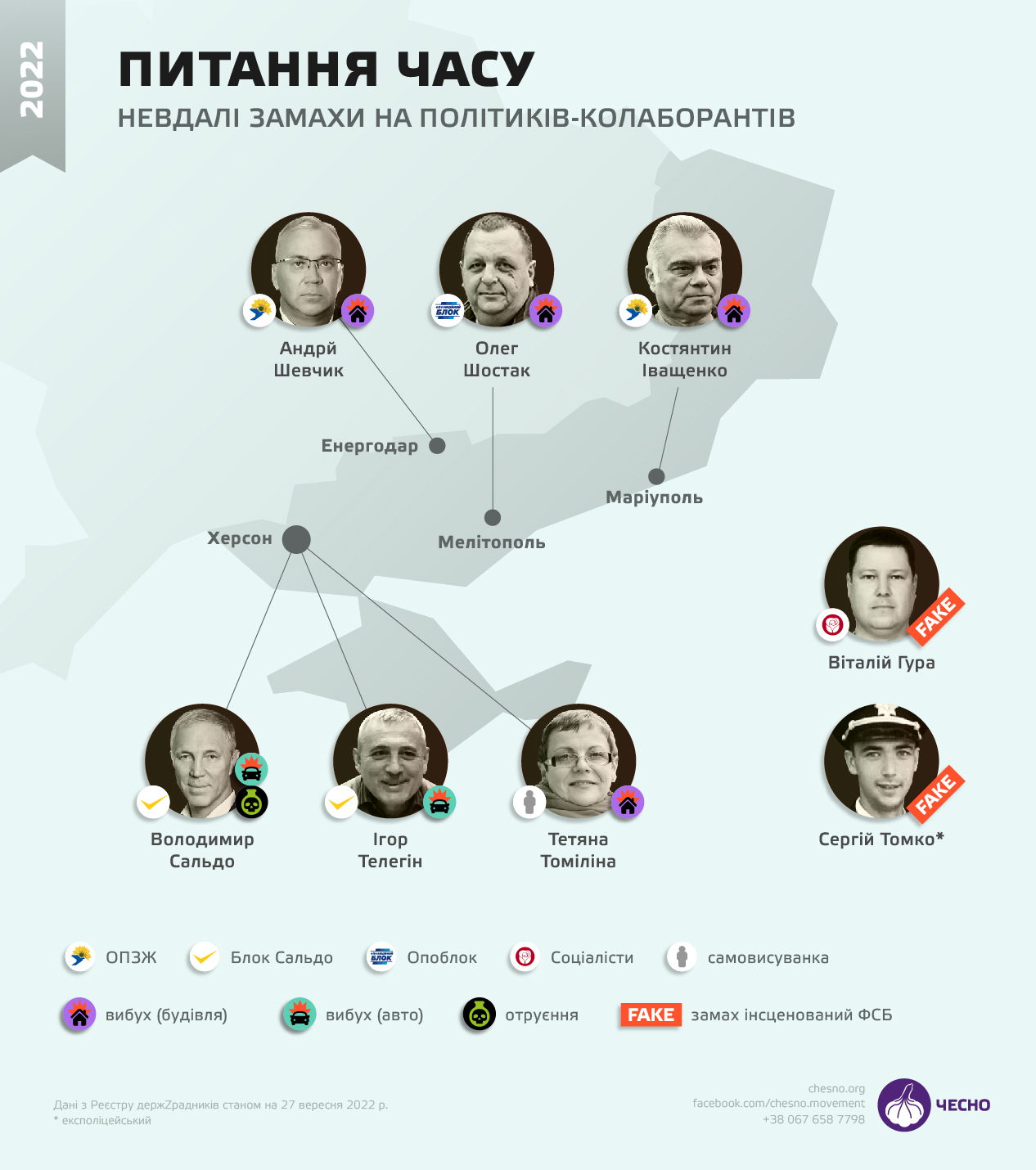 Представники Руху "Чесно" зауважила, що від початку повномасштабного вторгнення Росії в Україну наші партизани ліквідували щонайменше десятьох політиків-колаборантів. Ще шестеро зрадників змогли вижити після замахів, йдеться в матеріалі "ЧЕСНО".
