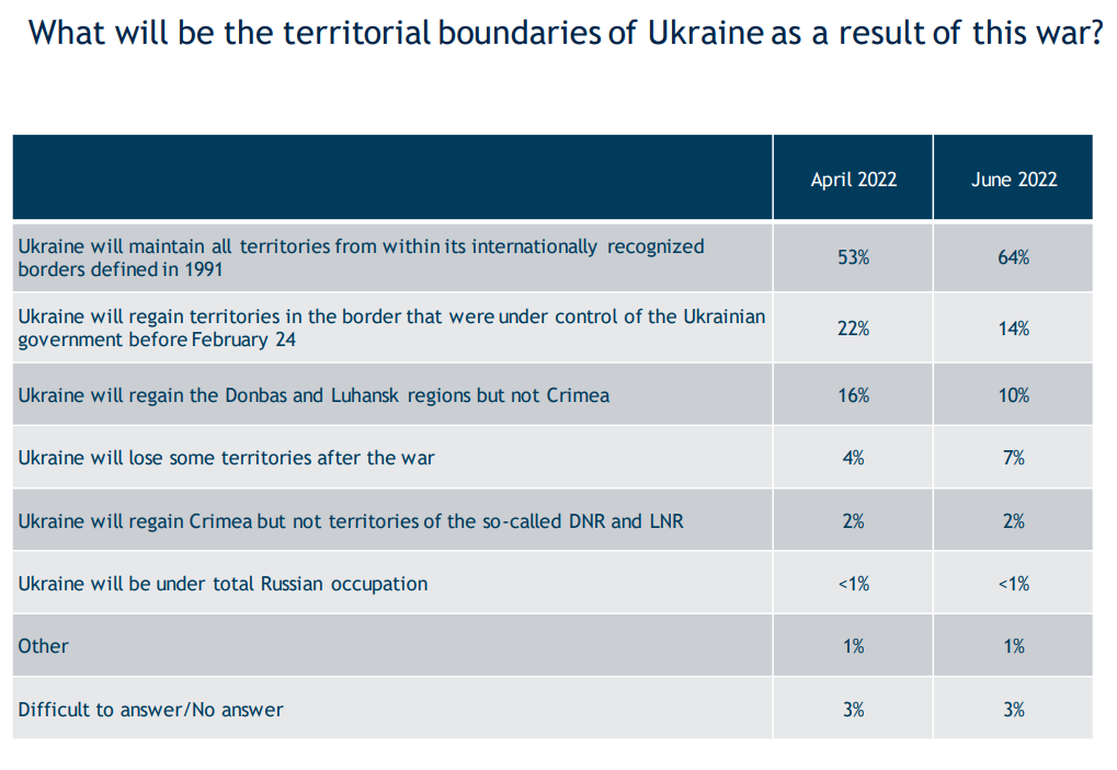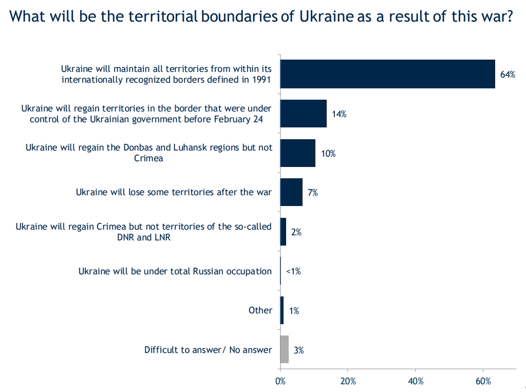 Крім того, переважна більшість українців упевнена, що країна не поступиться загарбникам будь-якими територіями. 64% опитаних вважають, що Україна все ж поверне всі землі в міжнародно визнаних кордонах 1991 року.