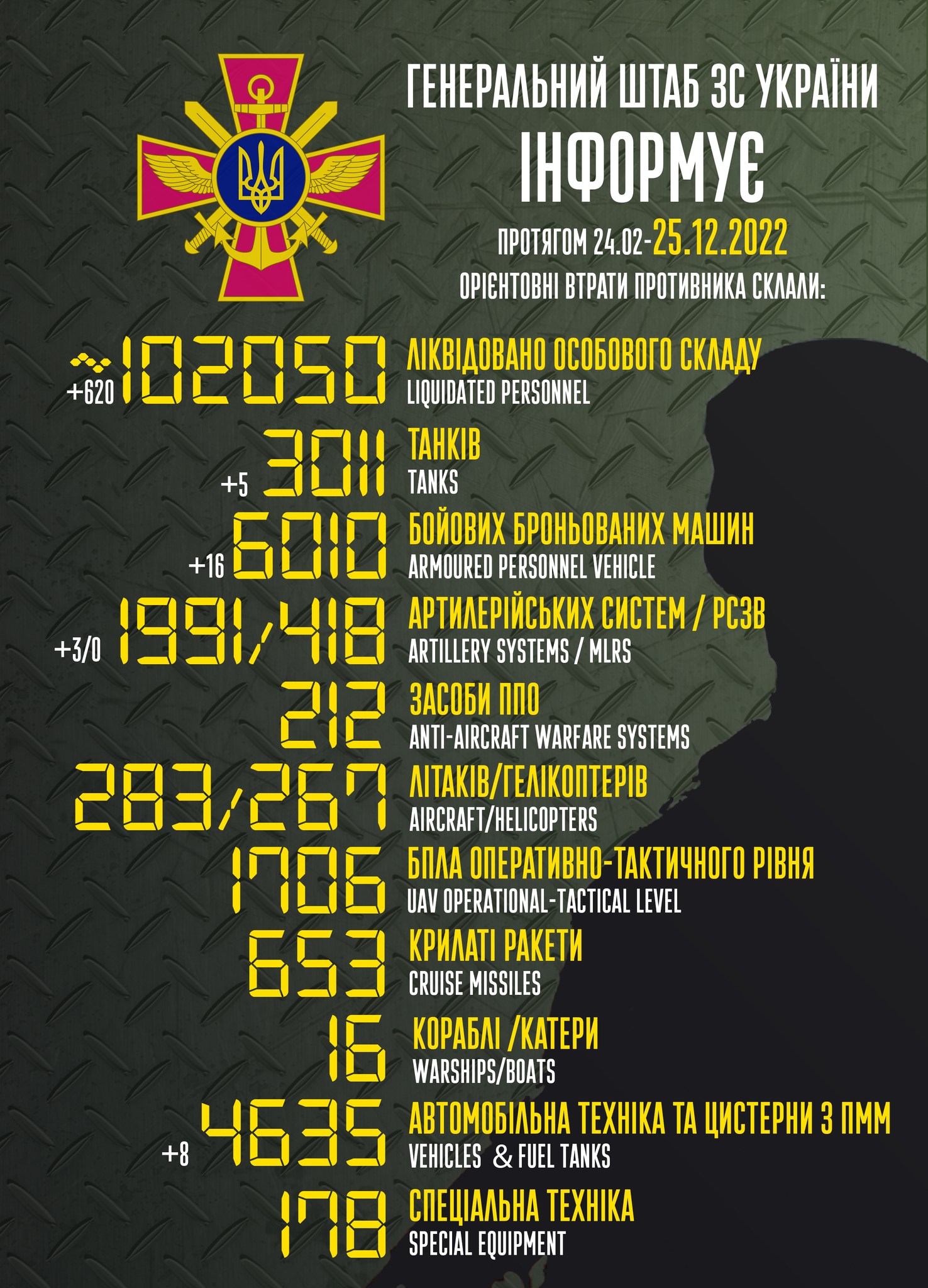 ЗСУ за вчора ліквідували 620 російських військових. Після цього загальні втрати ворога серед особового складу зросли до 102 050 "двохсотих". Про це повідомляє пресслужба Генштабу ЗСУ.