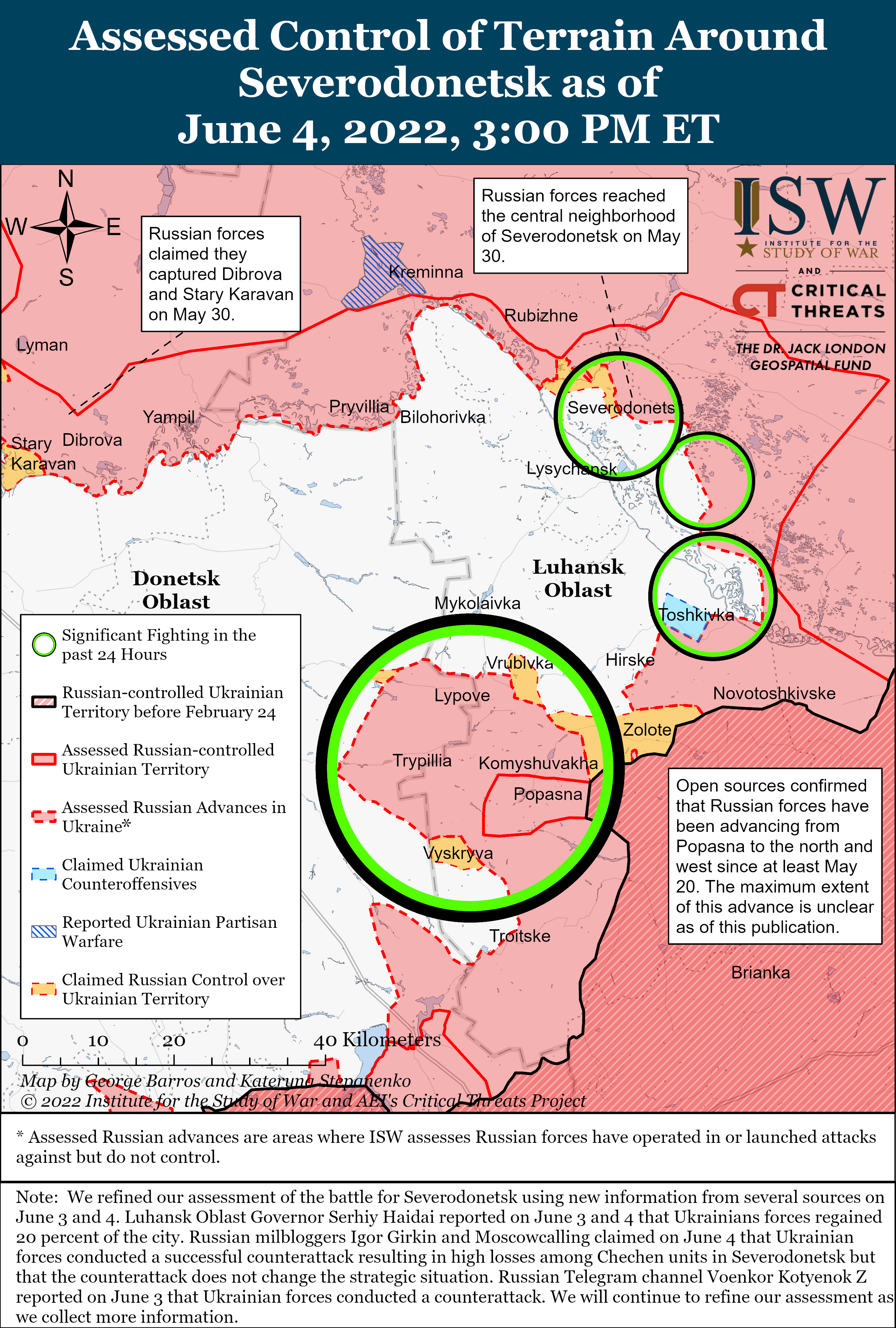 Запеклі бої за Сєвєродонецьк досі не припиняються, до того ж, завдяки вдалим контрнаступальним діям українських захисників вдалося відбити 20% міста у противника. Зухвалі настрої російських військ, зокрема чеченських підрозділів, коштували їм втрати контролю над майже чвертю міста та знищення значної кількості особового складу. Ситуацію на фронті російсько-української війни проаналізував Американський інститут вивчення війни (ISW).