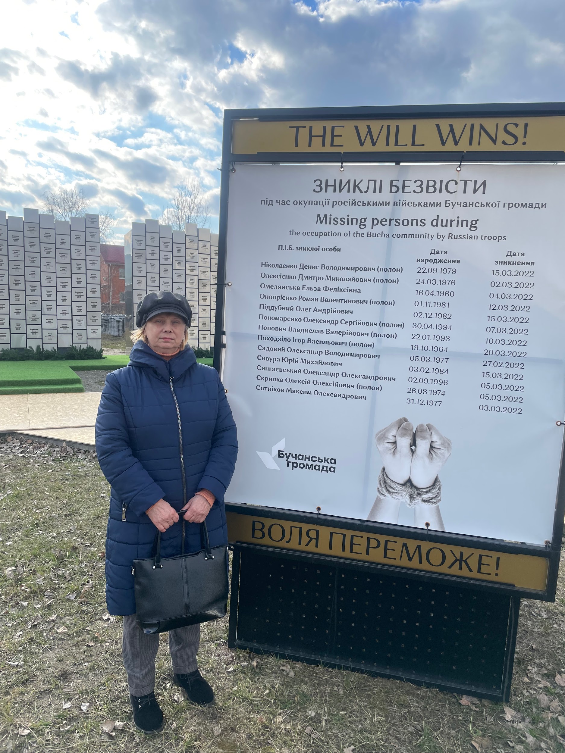 Тетяна, мама Дениса, в Бучі біля братської могили на території церкви, де стоїть стенд зі зниклими безвісти, серед яких у списку — і її син