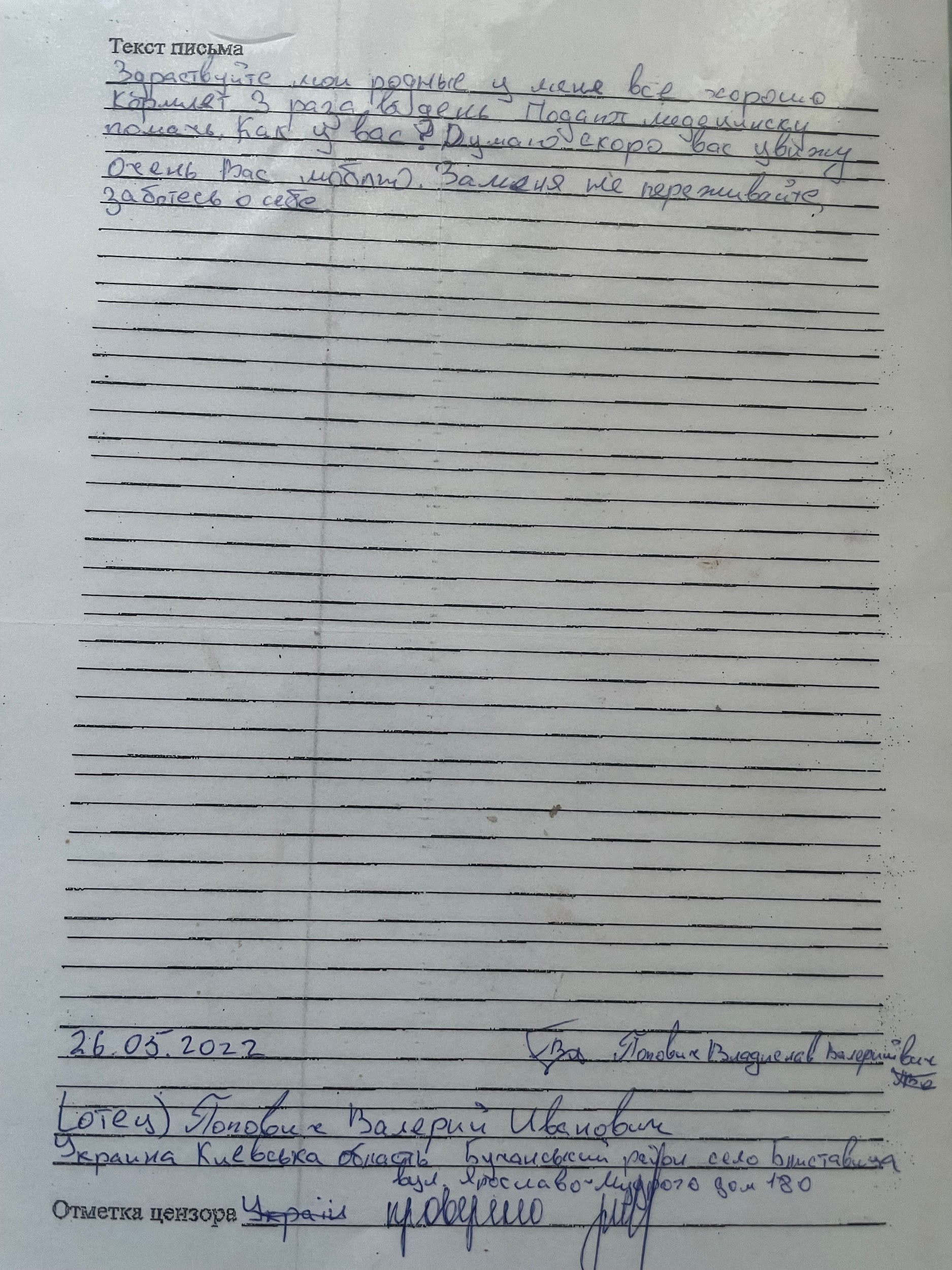 У листі кілька речень: із ним усе гаразд, годують тричі на день, надають медичну допомогу, а ще Влад пише, що сподівається скоро побачити рідних.