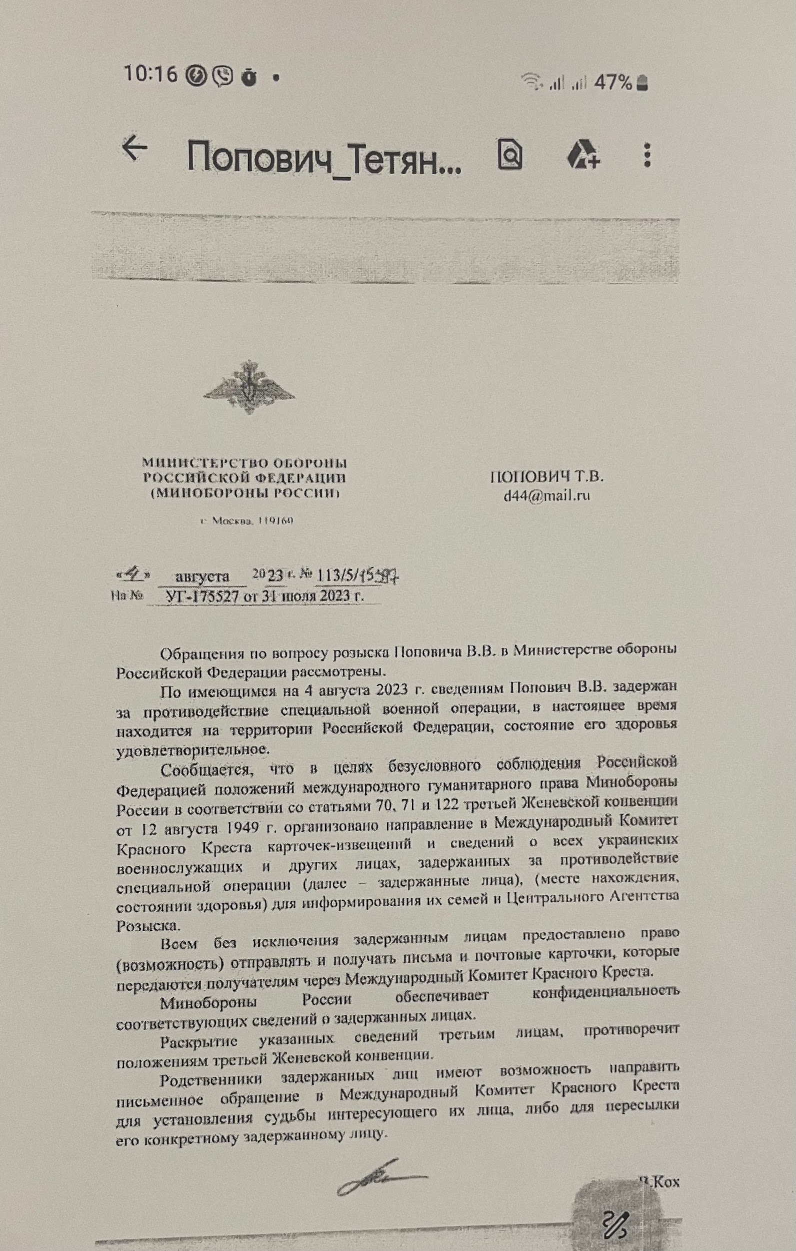 «По имеющимся на 4 августа 2023 года сведениям Попович В.В. задержан за противодействие специальной военной операции, на сегодняшний день находится на территории Российской Федерации, состояние его здоровья удовлетворительное».