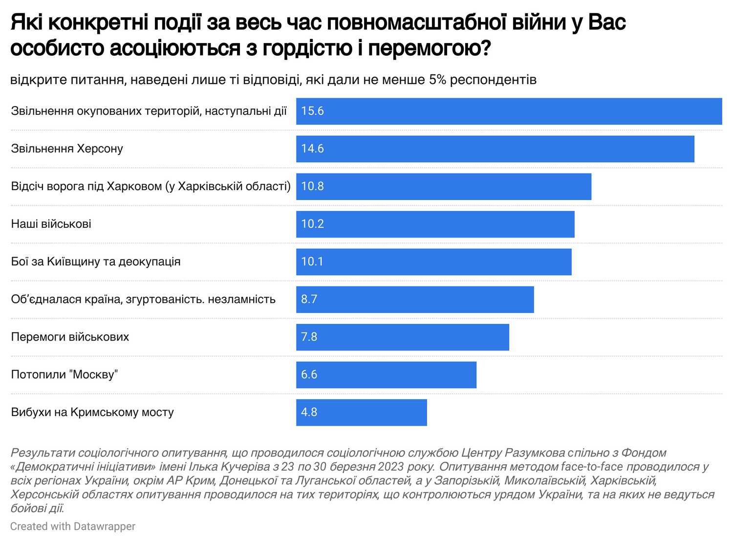 За даними опитування найважливішими подіями, які сприяли підтримці морального духу й асоціюються в громадян України з відчуттям гордості та перемоги були, зокрема, звільнення Херсона (15%), захист Харкова (11%), деокупація Київщини (10%). Також у переліку є загалом позитивні емоції від звільнення окупованих територій, гордість за українських військових та відчуття згуртованості суспільства.