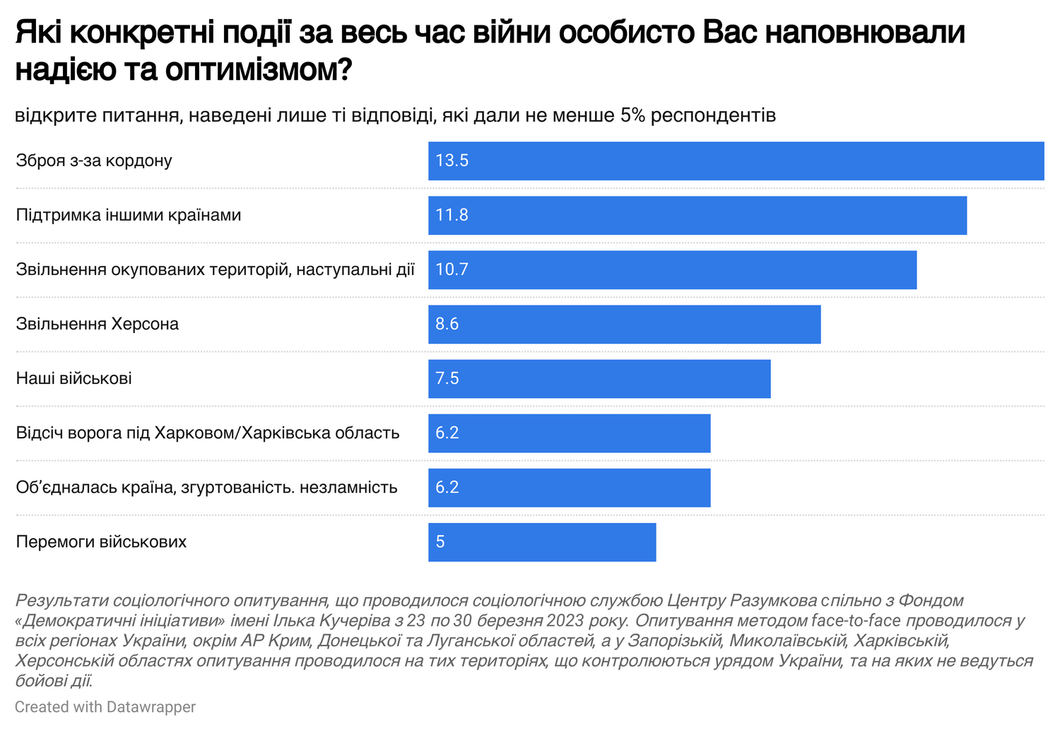 При цьому джерелом надії та оптимізму для українців є події, які свідчать про те, що Україна не залишилася наодинці з агресором. Так, 11% опитаних сповнювались надією через отримання зброї з-за кордону, а 10% зазначили, що оптимізм у них вселяла підтримка інших країн у цілому. Надію також приносили звістки про успіхи на полі бою: 9% респондентів згадали про наступальні дії, деокупацію та звільнення українських територій.