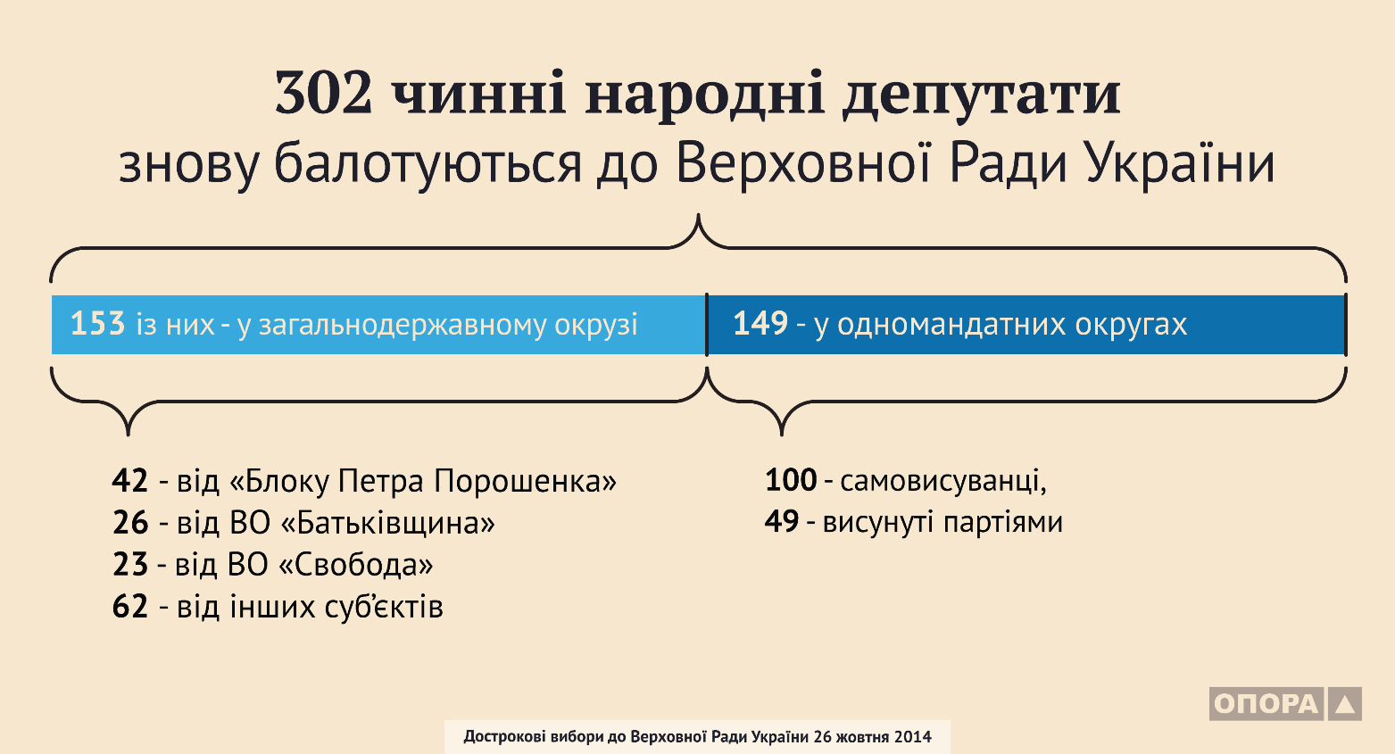 Як відзначають активісти, у цьогорічних виборах бере участь 302 із 450 парламентарів Верховної Ради сьомого скликання. Третина чинних народних депутатів (153 особи, 4,89 % від загальної кількості кандидатів зі списків) намагатимуться в чергове пройти до парламенту у списках партій.