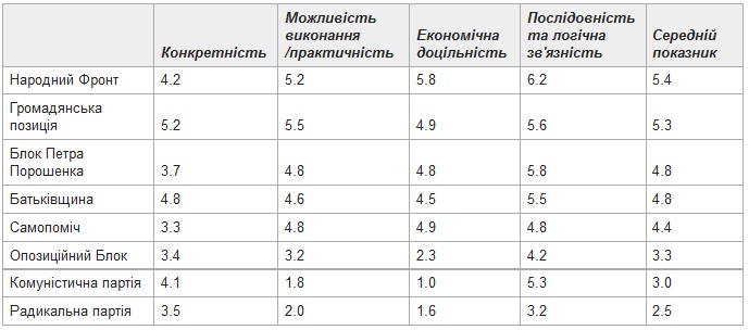 Експерти оцінювали партійні програми за чотирма параметрами конкретність (можливість виміряти обіцяні зміни) можливість виконання і практичність, економічна доцільність, послідовність та логічна зв'язність. По шкалі від 0 до 10 жодна політична сила не набрала в середньому більше за 5,4 бали.
