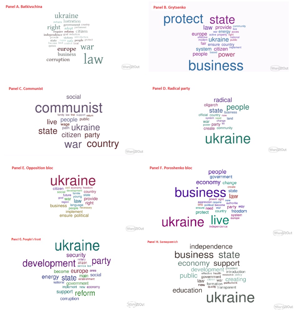 Дослідники поділили партії на три кластери. У верхньому опинилися "Народний Фронт" і "Громадянська Позиція", які посилають виборцям "відносно чіткі й послідовні повідомлення". Другий кластер, "Батьківщина", Блок Петра Порошенка, "Самопоміч", значно відстає від першого. "Партії в цьому кластері уникають ексцентричних обіцянок, але їхнім кампаніям не вистачає конкретності, і вони можуть робити нереалістичні й/або суперечливі обіцянки", - йдеться у звіті.