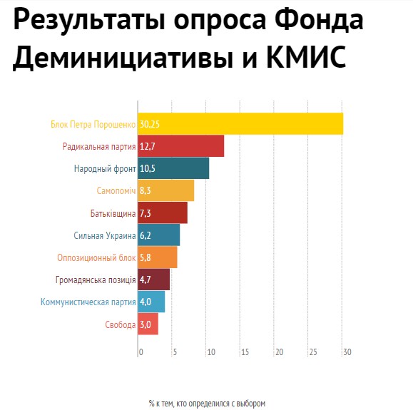 Подолати 5%-вий бар'єр на парламентських виборах 26 жовтня зберігають шанс десять політичних сил. Про це свідчать дані опитування Фонду "Демократичні ініціативи" і КМІС, яке було закінчене за тиждень до голосування.
