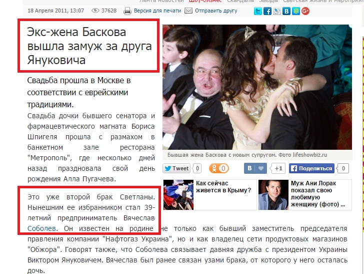 "Мабуть, найцікавіша частина його біографії розпочалася у 2011 році. У квітні Соболєв одружився на колишній дружині російського співака Миколи Баскова - Світлані Шпігель. Батько Світлани Борис Шпігель - впливовий російський фармацевтичний магнат і колишній сенатор. Про їхнє весілля повідомила газета "Сегодня", що належить Рінату Ахметову. У заголовку публікації В'ячеслав Соболєв був названий другом Януковича", - йдеться в статті.