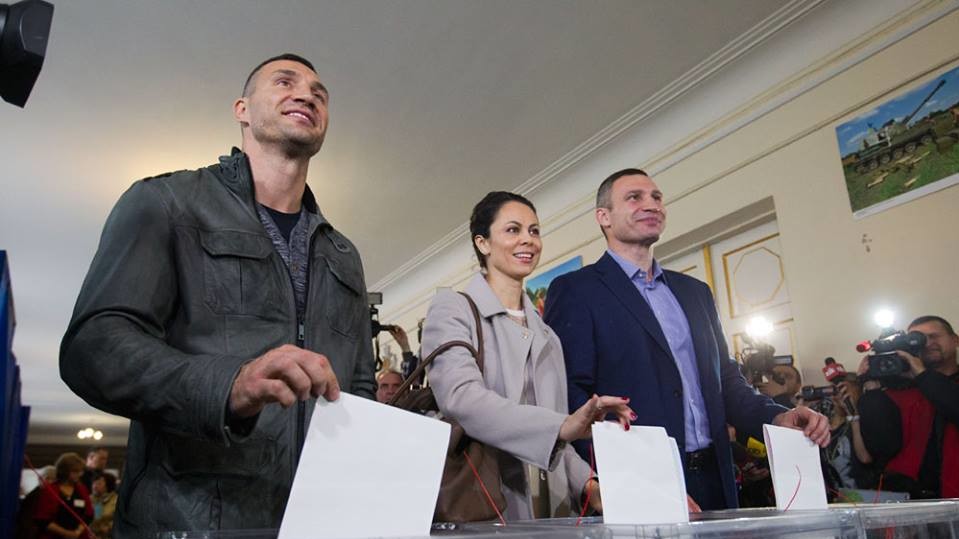 На місцевих виборах 25 жовтня українські політики прийшли голосувати на виборчі дільниці. Президент України Петро Порошенко прийшов на вибори з дружиною Мариною. Мер Києва Віталій Кличко прийшов на дільницю в компанії дружини Наталії та Володимира Кличко.