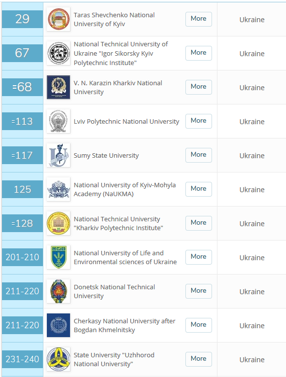 "Перше місце" серед українських вузів посів КНУ ім. Тараса Шевченка - університет розташувався на 29 місці. У минулому році вуз перебував на сходинку нижче. На 67 місце потрапила Київська політехніка, слідом розташувався ХНУ ім. В. Н. Каразіна.