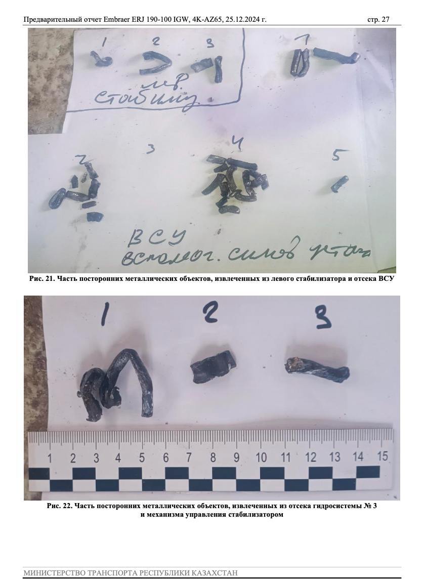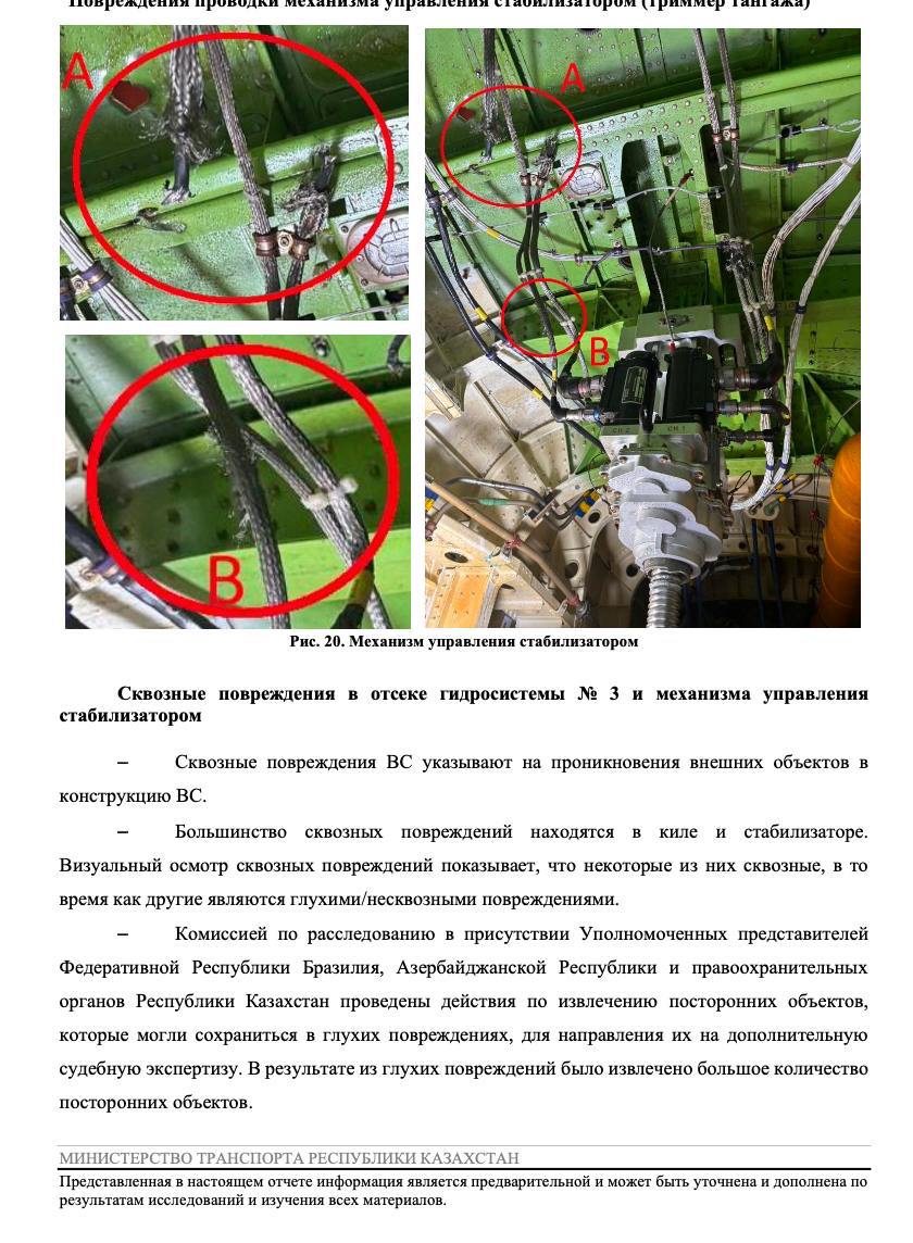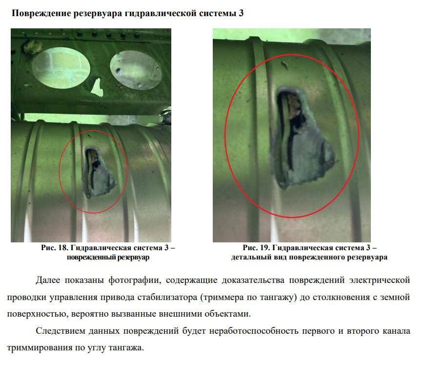 Зі звіту випливає, що в хвостовій частині фюзеляжу, кіля, стабілізатора і рулів виявлено безліч «наскрізних і ненаскрізних ушкоджень різної величини і форми». Вони також помічені на лівому крилі, лівому двигуні та інших компонентах літака. Ці елементи потрапили в літак ззовні до зіткнення судна із землею. Їх витягли і направили на додаткову експертизу.