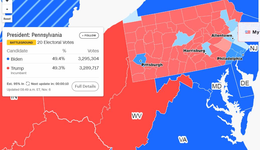 На цей час у Байдена 253 голоси вибірників. Якщо він виграє Пенсільванію, він подолає поріг у 270 голосів виборців й переможе на виборах президента США.