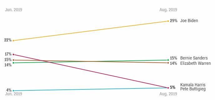 Байден з двозначним відривом випереджає своїх найближчих конкурентів по партії - Берні Сандерса на 14% і Елізабет Уоррен на 15%. Їх підтримка практично не змінилася з початку літа.