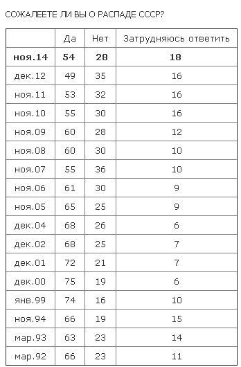 Для порівняння, в грудні 2012-го кількість тих, хто не бажав би розпаду СРСР, становила 49%, протилежної думки дотримувалися 35% опитаних.
