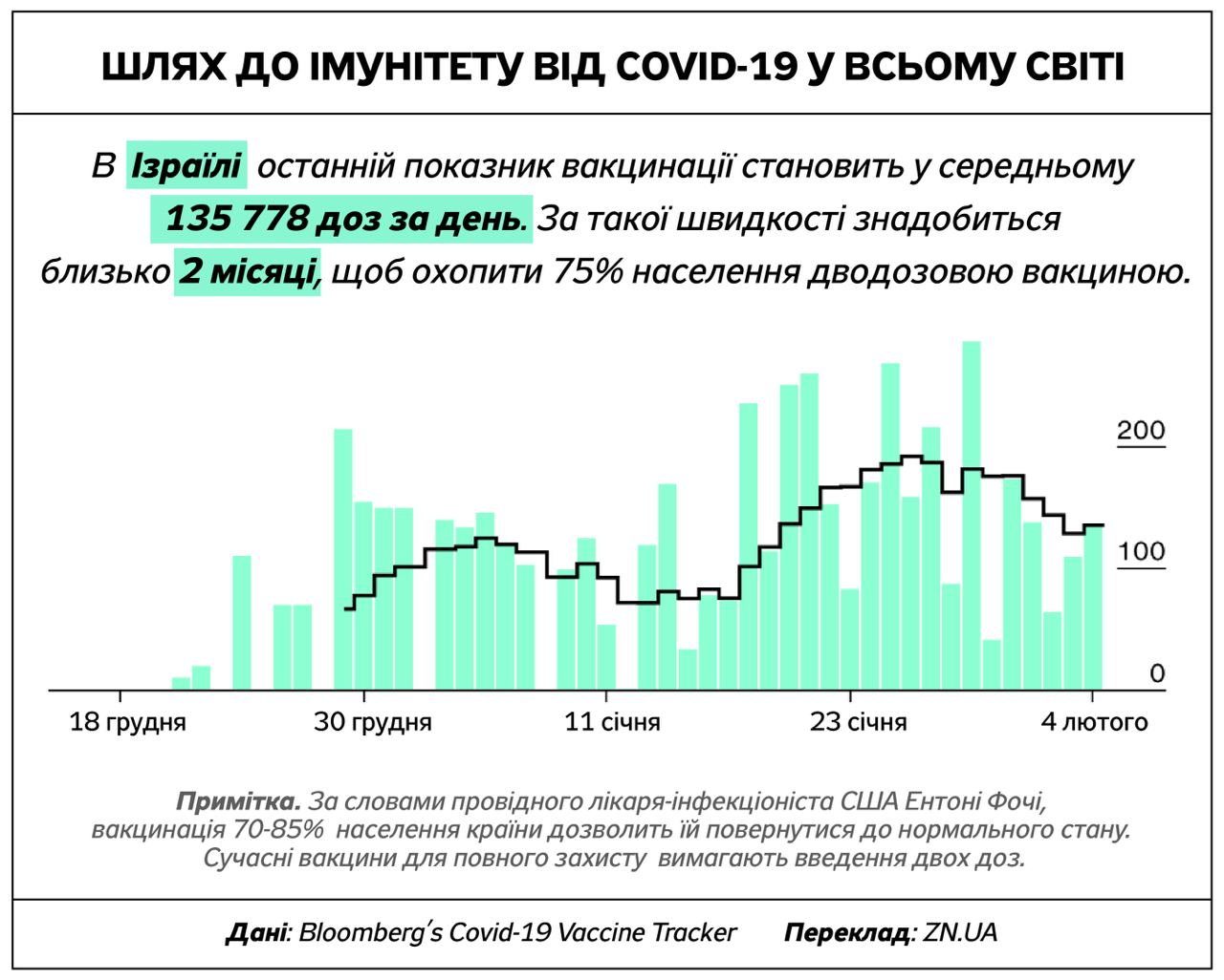 Американські вчені вважають, що для того, аби ситуація з ковідом стабілізувалася, вакцину повинні отримати від 70% до 85% населення. Деякі країни домагаються більш швидкого прогресу, ніж інші, націлюючись на 75% охоплення вакциною двома дозами, про що йдеться у звіті Bloomberg Vaccine Tracker.