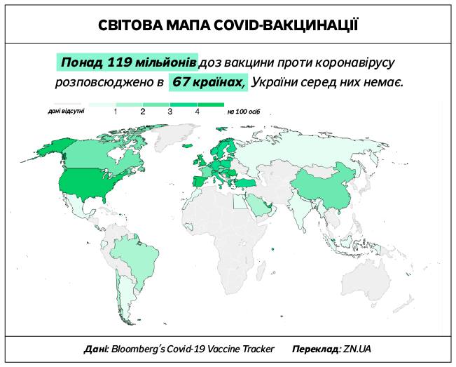 "Понад 119 мільйонів доз вакцин уже були введені в 67 країнах. Останній показник становив приблизно 4,54 мільйона доз на день", - пише видання, опираючись на власні розрахунки.