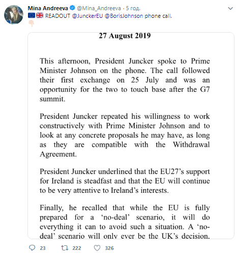 "Президент Юнкер повторив свою готовність конструктивно працювати з прем'єр-міністром Джонсоном і розглянути будь-які конкретні пропозиції, які у нього можуть бути, за умови, що вони сумісні з Угодою про вихід", – сказано у заяві.