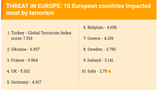 Останніми трьома країнами, які увійшли в топ-10 найбільш небезпечних країн через загрозу терактів у святкові дні стали Швеція, Ірландія та Італія.
