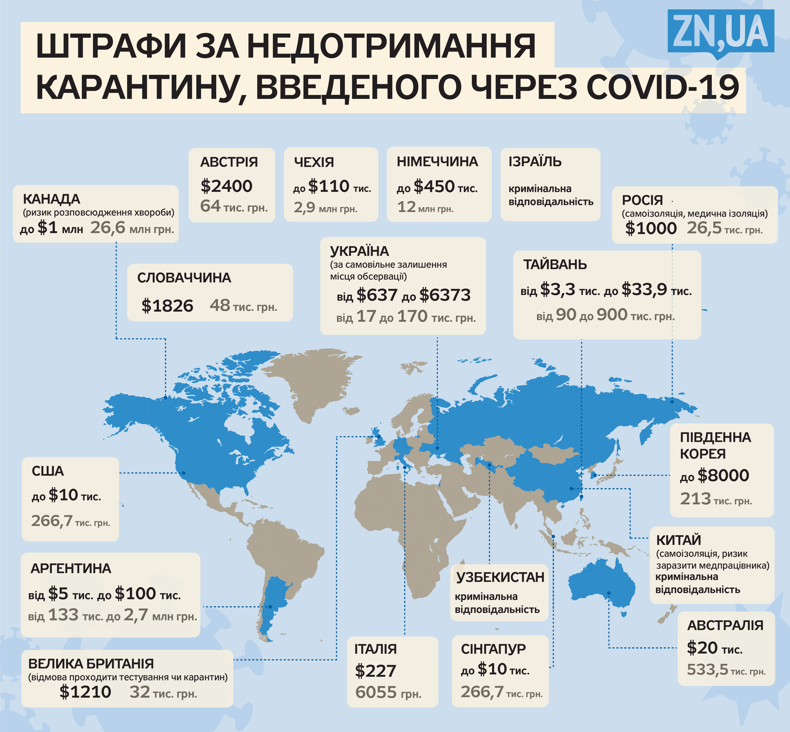 У вівторок, 17 березня, Верховна Рада України ухвалила закон щодо протидії коронавірусу, яким передбачається кримінальна й адміністративна відповідальність за порушення заходів запобігання розповсюдження інфекційних захворювань. ZN.UA підготувало інфографіку, в якій порівняло розміри штрафів за порушення правил карантину у світі.