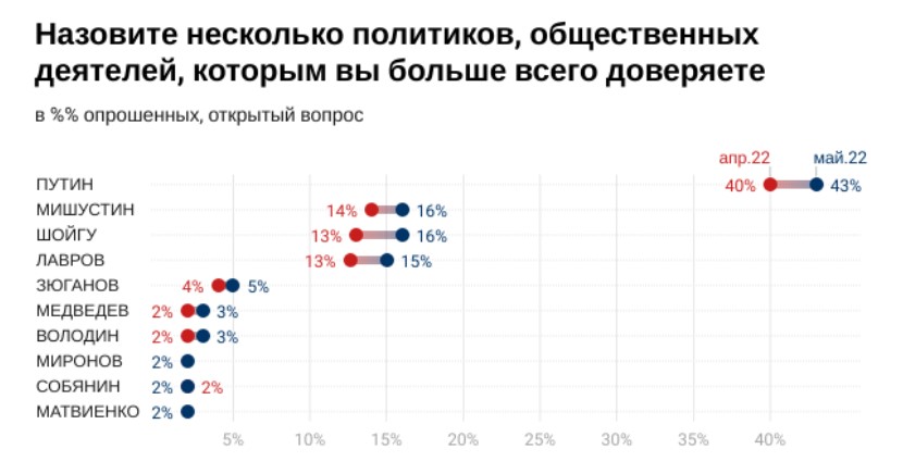При цьому довіряють Путіну лише 43 відсотки росіян. Порівняно з квітнем цей показник зріс на три відсотки. Також дещо збільшилася довіра Міхаілу Мішустіну, Сєргєю Шойгу (до 16%) та Сєргєю Лаврову (до 15%).