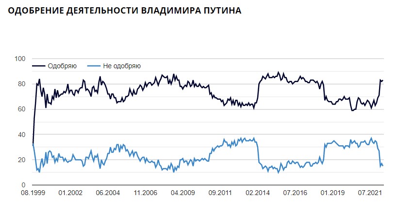 У лютому, згідно з їхніми опитуваннями, роботу Путіна схвалювали 71 відсоток громадян РФ. Наприкінці зими чверть росіян не підтримувала диктатора – 27 відсотків.