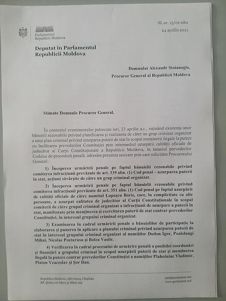 Депутати від PAS Сергій Литвиненко та Вірджиліу Писларюк вимагають провести кримінальне розслідування спроби узурпації влади «організованою злочинною групою, очолюваною Додоном», і з'ясувати, чи не причетні до неї депутат Ілан Шор і екслідер «Демократичної партії» Владімір Плахотнюк, який знаходиться в розшуку.