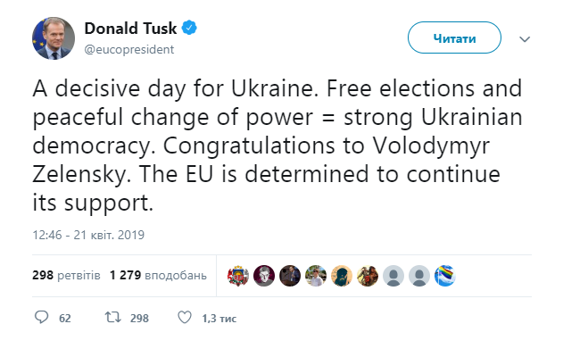 "Вільні вибори і мирна зміна влади – це сильна українська демократія. Вітаємо Володимира Зеленського. ЄС сповнений рішучості продовжувати свою підтримку", – написав він у Twitter.