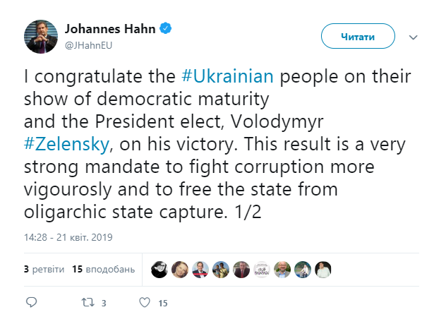 Функціонери Європейського союзу привітали кандидата в президенти України, шоумена Володимира Зеленського, з перемогою у другому турі президентських виборів. Зокрема, європейський комісар з питань Європейської політики сусідства Йоханнес Ган у своєму Twitter закликав Зеленського і далі боротися проти корупції та вести реформування країни.