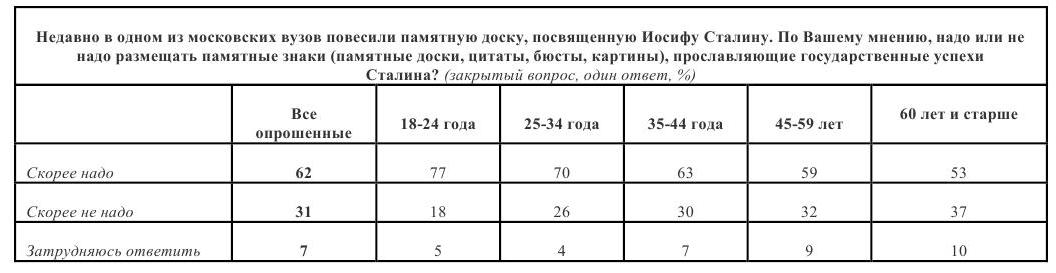 Майже дві третини жителів Росії (62%) згодні з думкою, що дошки, бюсти, картини тощо, які розповідають про успіхи Сталіна, потрібно розміщувати в публічних місцях, свідчать дані опитування ВЦИОМ.