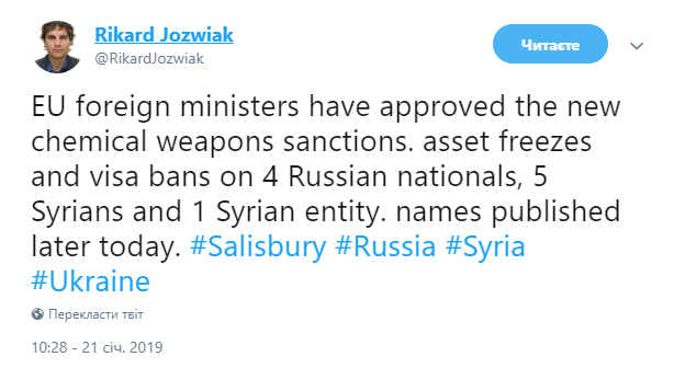 "Міністри закордонних справ ЄС схвалили нові санкції за використання хімічної зброї. Заморожування активів і заборона на видачу віз торкнеться 4 громадян Росії, 5 сирійців і 1 сирійської юридичної особи", - йдеться в повідомленні.