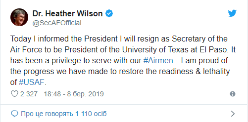 Вілсон додала, що про свої плани звільнитися з ВПС США вона вже поінформувала президента Дональда Трампа, і назвала дату відставки - орієнтовно, датою стане 31 травня.