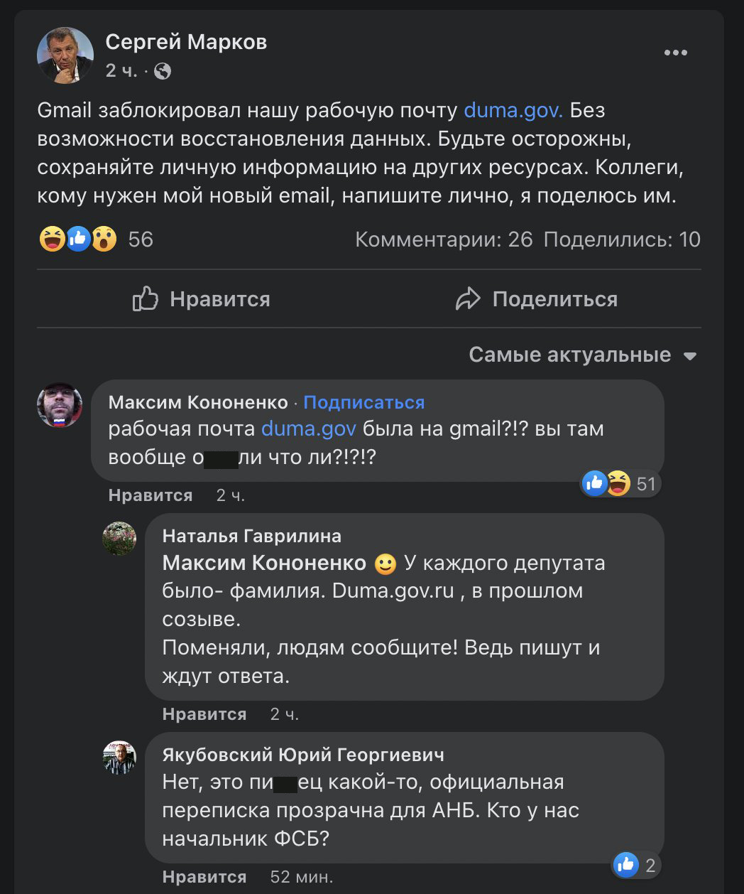 Російський політолог Сєргєй Марков заявив, що робочу пошту Держдуми заблокував Google. Про це він написав у своєму Facebook, а скріни зі сторінки розлетілися соцмережами.