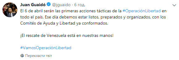 Лідер венесуельської опозиції Хуан Гуайдо, який оголосив себе "тимчасовим президентом країни", озвучив дату початку операції "Свобода", яка, як він вважає, має призвести до падіння режиму чинного президента Венесуели Ніколаса Мадуро. Операція розпочнеться 6 квітня, написав опозиціонер у своєму Twitter.