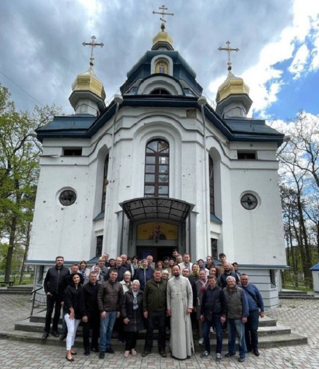 Прихожани разом з настоятелем сфотографувалися на фоні обстріляного російськими військовими храму. Нагадаємо, Ірпінь був понад місяць окупований і після звільнення світ вжахнувся від звірств, які там вчиняла російська армія.