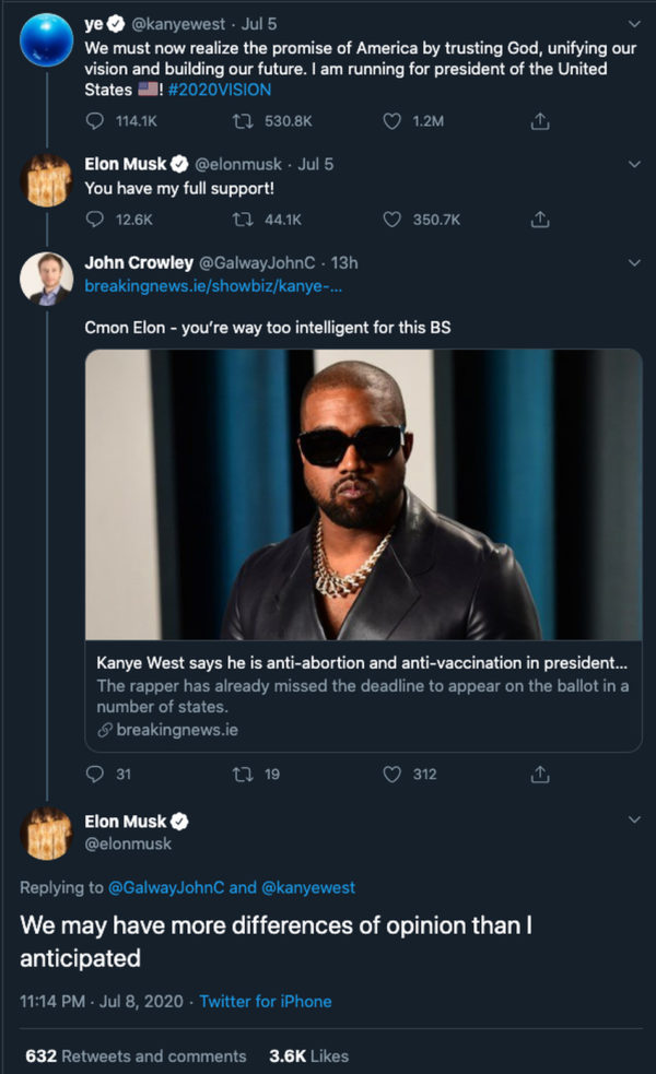 Після оприлюднення провокаційного інтерв'ю музиканта в журналі Forbes Маск констатував, що їхні погляди, м'яко кажучи, не дуже близькі, передає Mashable.