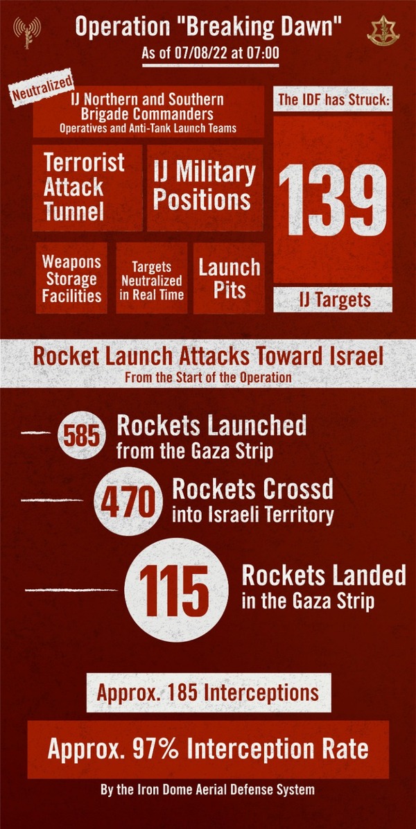 Як відомо, Ізраїль дві доби тому розпочав операцію»Світанок» в результаті якої ліквідував ватажка "Ісламського джихаду" Тайсіра Джабарі. Після чого ісламські терористи почали обстріли міст на півдні Ізраїлю. У відповідь ЦАХАЛ розпочав широкомасштабну повітряну операцію проти "Ісламського джихаду" в Секторі Гази.