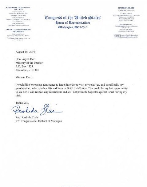 У своєму письмовому проханні до міністра внутрішніх справ Ар'є Дері Тлаїб пообіцяла, що не буде закликати до бойкоту Ізраїлю під час своєї поїздки в цю країну.