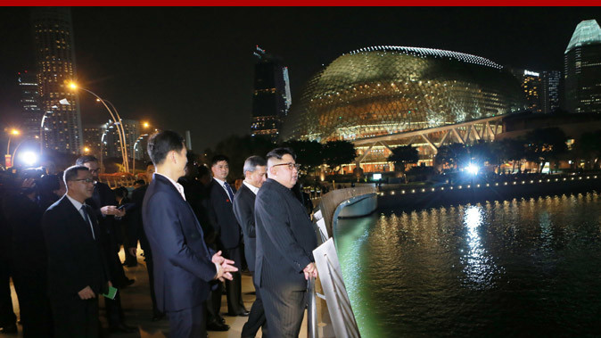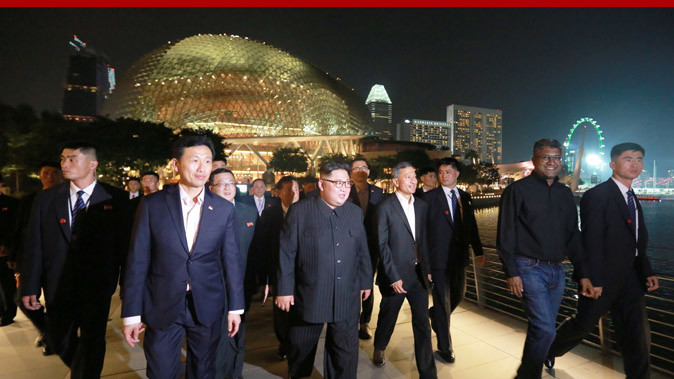Близько 21 години вечора Кім Чен Ин вийшов до свого чорного лімузина в супроводі своєї сестри Кім Йо Чон і помічників. У кортеж лідера КНДР увійшли автобуси зі співробітниками його охорони і помічниками, а також супровід - десятки сінгапурських поліцейських на мотоциклах. Його першою зупинкою був парк з футуристичними, деревовидними інсталяціями, Сад біля затоки, який також може похвалитися найбільшою скляною теплицею і найвищим критим водоспадом у світі.