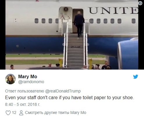 Користувачі соціальних мереж активно обговорюють відео, на якому видно, що до черевика президента США Дональда Трампа, який піднімався на борт літака, прилип туалетний папір. При цьому, ніхто з його оточення не повідомив йому про це.