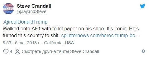 Як повідомляє "Новое время", критики Трампа не упустили можливості звернути увагу на цей конфуз, провівши аналогії зі стилем управління президента США. "Навіть вашим співробітникам все одно, чи є у вас туалетний папір на взутті", "Це іронія. Він перетворив цю країну на *** (продукти життєдіяльності)", - писали користувачі соцмереж.
