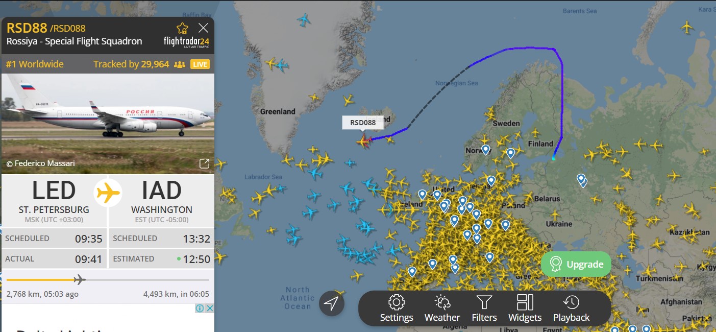Бортом президента РФ "Росія" вилетів із Санкт-Петербурга до Вашингтона, показує авіатрекер FlightRadar.